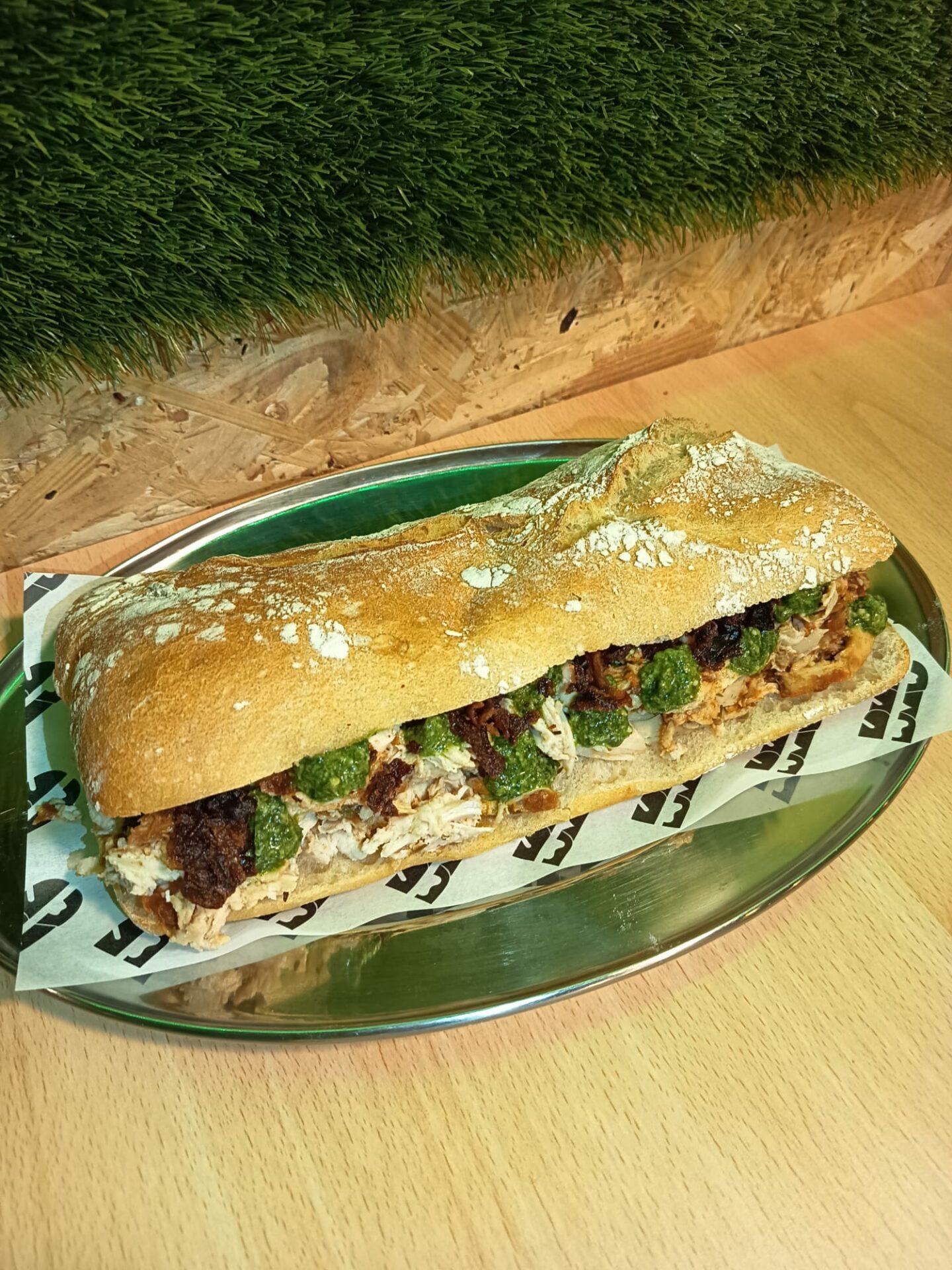 Pollo asado y deshilachado, chutney de tomate, pesto de albahaca y bacon crunchy.