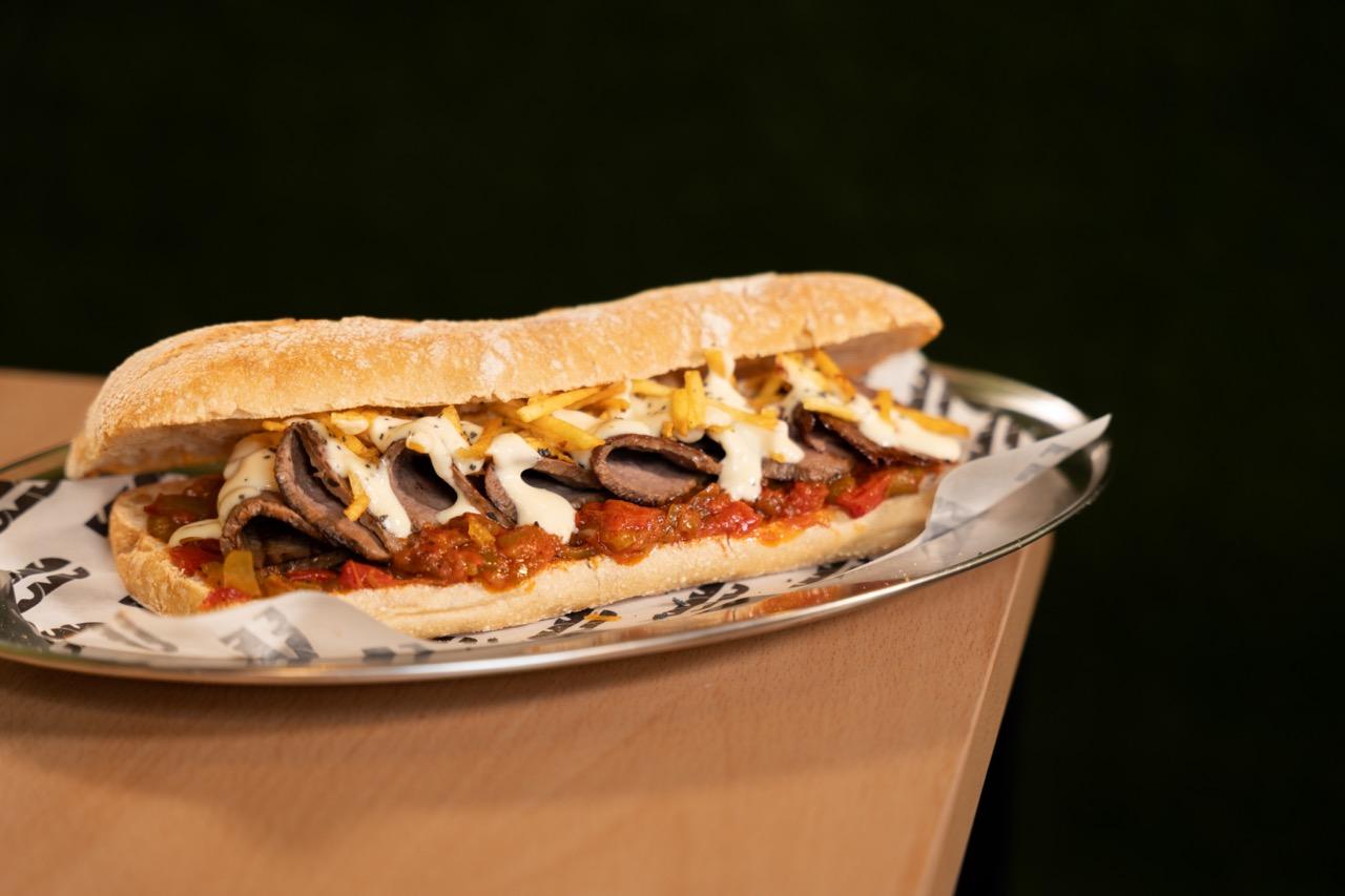 Oreja adobada a baja temperatura, queso provolone y mayonesa de ajo asado.