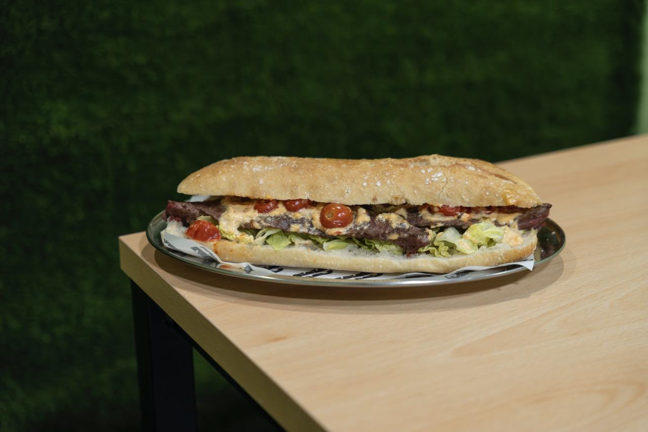 Picaña, queso manchego, mayonesa de pimiento asado, mezclum de lechugas y tomate cherry salteado.