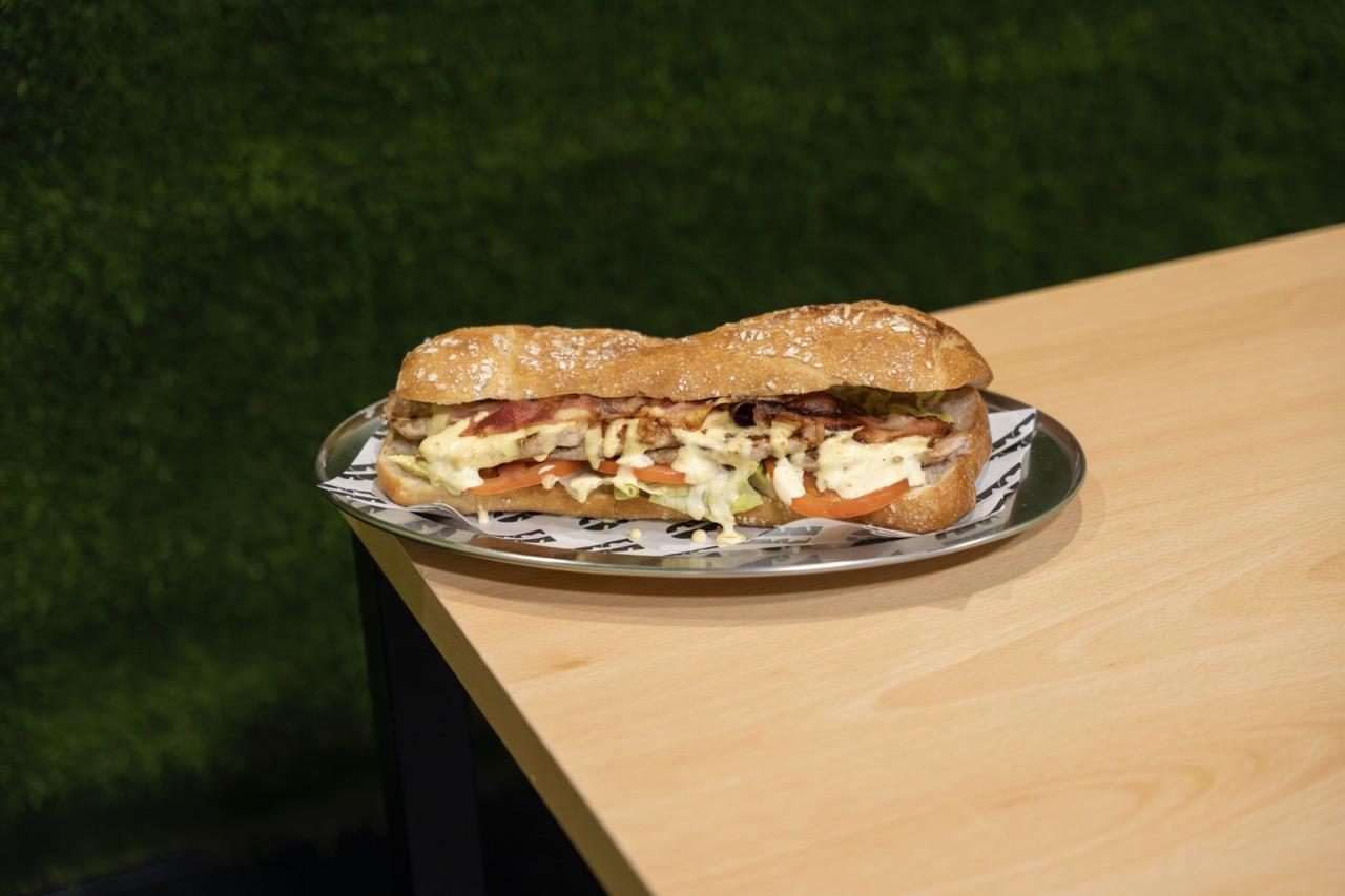 Lomo cerdo, bacon, queso manchego, mayonesa huevo frito, mezcla de lechugas y tomate.