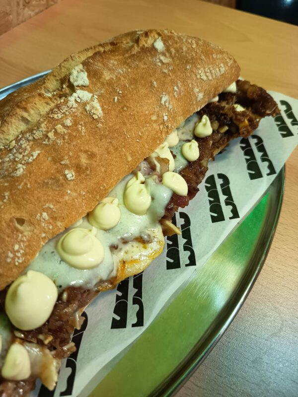Oreja adobada a baja temperatura, queso provolone y mayonesa de ajo asado.